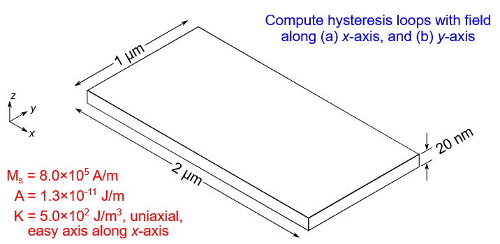 system = mm.System(name="standard_problem1")Here we define the material parameters and the energies we will take into account.